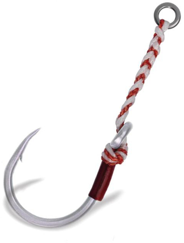 The VMC FishFighter Tin Coated Assist Hooks deliver high-performance strength and precision, built from forged hi-carbon steel with a needle-sharp point for superior penetration. Featuring an extra-wide gap and tin coating for corrosion resistance, they excel with braided lines, combining Dyneema flexibility and Kevlar abrasion resistance. Available in multiple sizes with red and white braid options for easy identification.